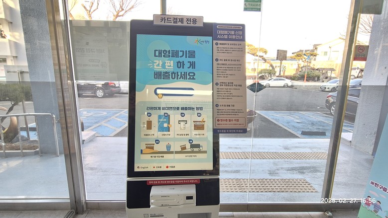 키오스크는 폐기물 배출 접수와 결제가 동시에 가능하며 신용카드 결제가 가능해 간편하게 사용할 수 있다. 그동안 대형폐기물 배출은 인터넷을 이용해 접수하거나, 읍면사무소에 직접 방문해 신고필증을 구입 후 배출해야 했다.