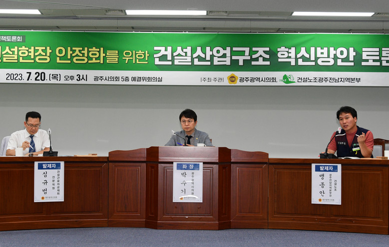 [광주 세계타임즈=손권일 기자] 광주시의회 박수기 의원(더불어민주당·광산구5)은 20일, 시의회 예결위회의실에서 "지역 건설현장 안정화를 위한 건설산업구조 혁신방안 토론회"를 개최했다. 이 토론회는 건설현장의 갈등과 분쟁을 조정하고, 지역 건설산업의 활성화와 건설 노동자의 고용안정을 논의하기 마련된 정책토론회였다.