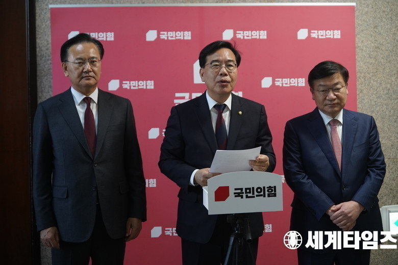 [세계타임즈=신상철 기자] 국민의힘 '송언석' 원내대표가 2일 국회에서 이재명 대통령의 추가경정예산 시정연설과 관련해 기자회견을 하고있다.