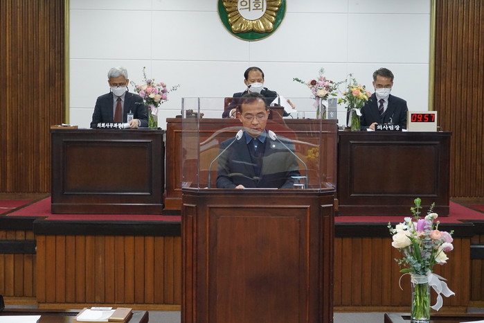 김기하 의장은 개회사를 통하여 “내실있는 현안사업 추진으로 신성장 동력사업을 완성하여 일자리와 소득이 늘어나는 경제관광으로의 변화를 꾀하고 지역경제 회복과 도약의 기반을 마련해야한다.”고 촉구하며,
