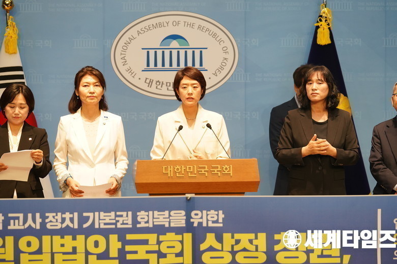 '고민정' 더불어민주당 의원이 15일 서울 여의도 국회 소통관에서 열린 학교 밖 교사 정치기본권 회복을 위한 교원 입법안 국회상정 청원 기자회견에서 발언을 하고 있다.