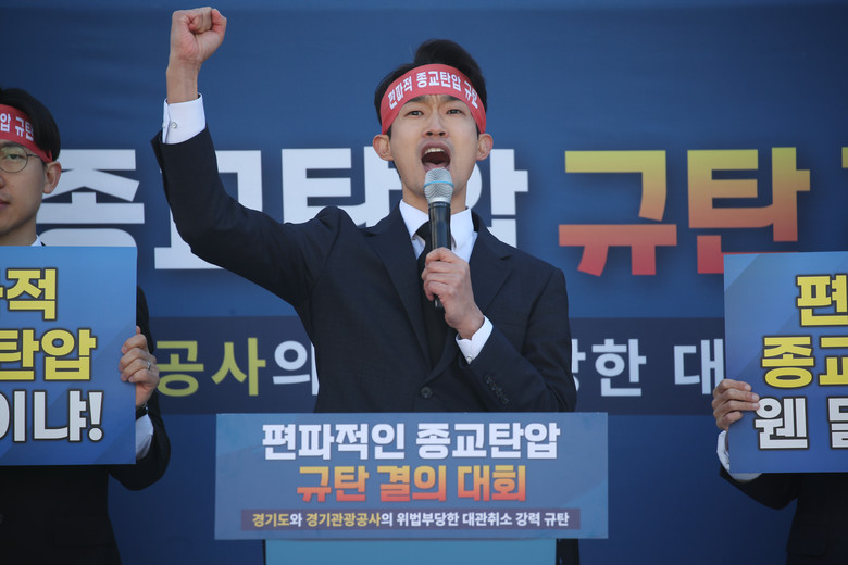 이어 “지난 15일 궐기대회 개최 소식에 경기도지사는 경기도기독교총연합회와 오찬 간담회를 11일에 갑작스럽게 생긴 것은 우연이 아닌 편파 행정”이라며 “헌법상 정교분리의 원칙을 지켜 종교의 자유를 보장하라” 말했다.