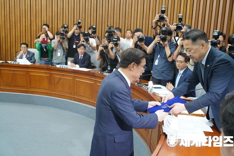 이종석 국가정보원장 후보자가 19일 서울 여의도 국회 정보위원회에서 열린 인사청문회에서 선서문을 신성범 위원장에게 전달하고있다.
