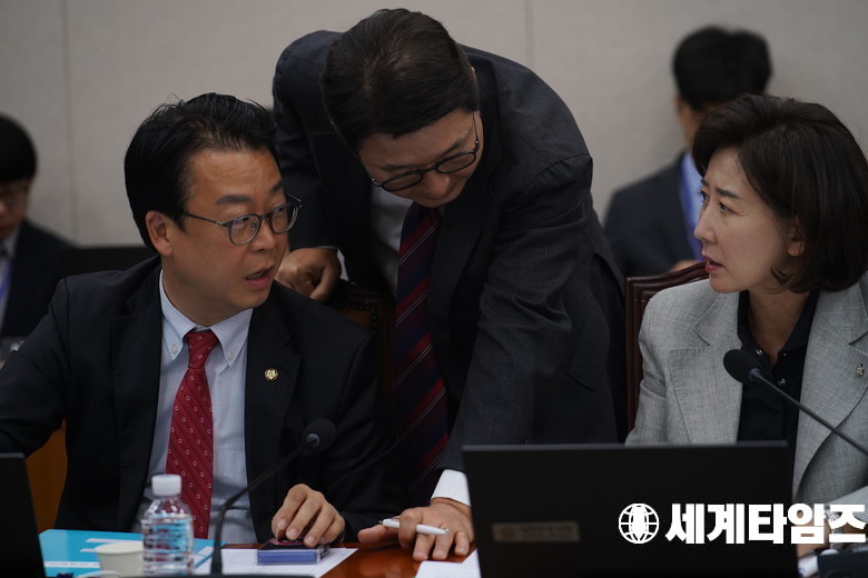 10일 서울 여의도 국회에서 열린 법제사법위원회 전체회의에서 국민의힘 곽규택, 신동욱, 나경원 의원이 대화를 하고 있다.세계타임즈 / 신상철 기자 news@thesegye.com