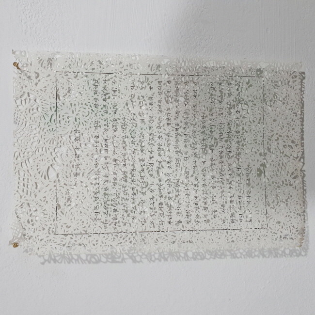 전시 측은 "작가의 외부적 시선은 '교과서' 시리즈에서도 볼 수 있다. 작가가 중, 고등학교 시절 공부한 가정, 가사는 여학생들을 대상으로 가부장적이고 사회에서 억압적인 여성의 역할을 강조, 강화하고, 교련은 북한을 주적으로 규정하고 전시 중 여성의 역할을 남성과 가정을 보살피고 간호하는데 한정시켰다. '가사'와 모든 교과서에 수록됐던 '국민교육 현장'에서 작가는 레이스 패턴을 이용해 독재 정부가 만들어낸 주입식 내러티브를 해체한다"고 설명하고 있다.