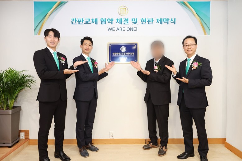 ▲지난 14일 ‘간판 교체 협약 체결 및 현판 제막식’이 진행되는 가운데 유영빈 담임 강사(왼쪽)와 대한예수교장로회 오모 목사가 협약서를 들고 기념촬영 하는 모습 [사진 제공 = 신천지 화곡교회]