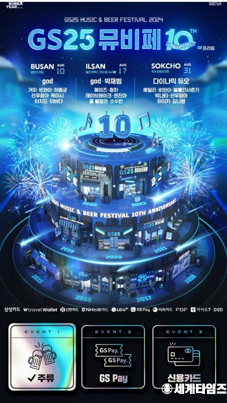 - GS25 ‘뮤직앤비어페스티벌’ 10회째 맞아 6만명 규모로 8월에 부산, 일산, 속초서 3회 열려