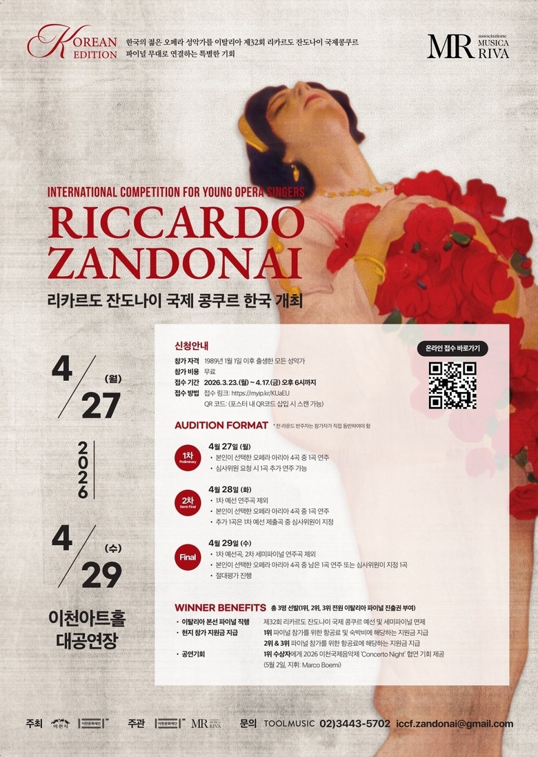 그동안 국내 성악가들은 실력이 뛰어남에도 불구하고 막대한 해외 예선 참가 비용과 정보 접근의 한계로 인해 국제 무대 진출에 어려움을 겪어왔다. 이러한 여건을 개선하고자 이번 콩쿠르의 참가비는 무료로 운영된다. 또한 최종 선발된 수상자 3인 전원에게는 오는 6월 이탈리아에서 열리는 ‘제32회 리카르도 잔도나이 국제 콩쿠르’ 파이널 진출권이 부여되며 예선과 세미파이널이 면제되는 혜택이 주어진다.