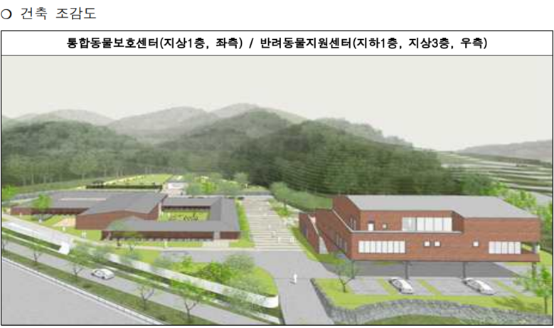 (창원시가 준공 계획 중인 통합동물보호센터(지상1층, 좌측), 반려동물지원센터(지하1층, 지상3층, 우측)의 건물 조감도)