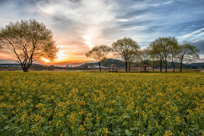지난가을 합천군 농업기술센터에서 황강변에 뿌린유채가 활짝 피었다. 혹독한 추위 이겨낸 유채 꽃 송이마다 일출빛 스며들어 황금빛으로 가득하다.