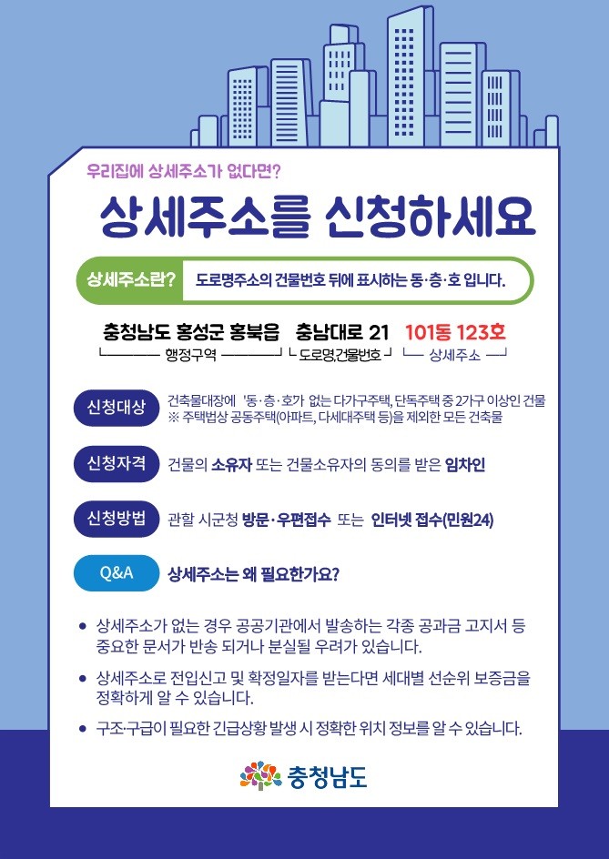 임택빈 도 토지관리과장은 “상세주소가 부여되면 아파트처럼 법정주소로 편리하게 사용할 수 있을 것”이라며 “쪽방촌과 같은 상세주소 부여가 필요한 복지 사각지대가 없는지 세심하게 살피고 도민의 안전과 생활 편의를 위한 행정 서비스를 적재적소에 제공할 수 있도록 힘쓸 것”이라고 말했다.
