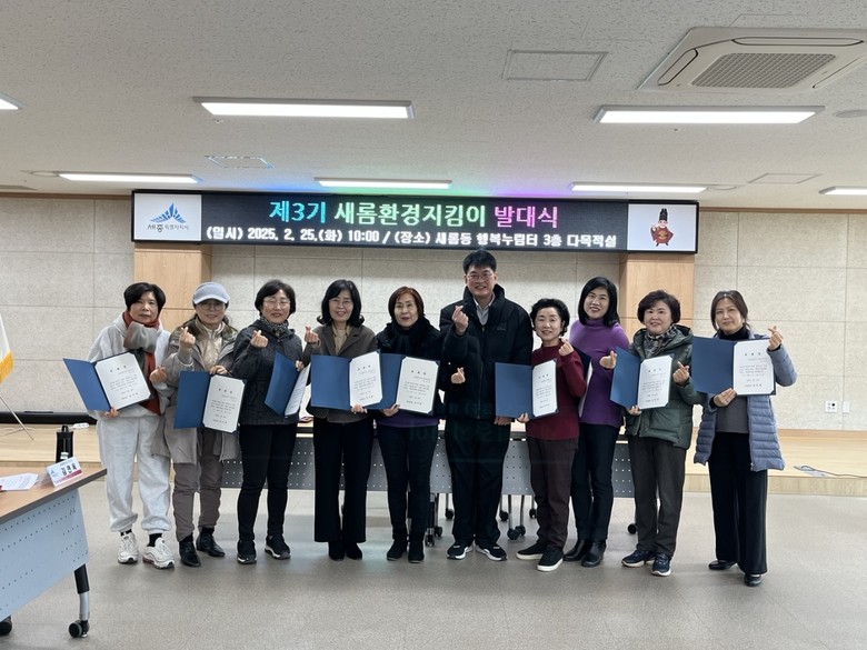 이날 발대식에서는 제3기 새롬환경지킴이로 위촉된 주민 9명에게 위촉장을 수여하고, 자원봉사자 주의사항 및 활동구역에 대해 논의하는 시간을 가졌다.