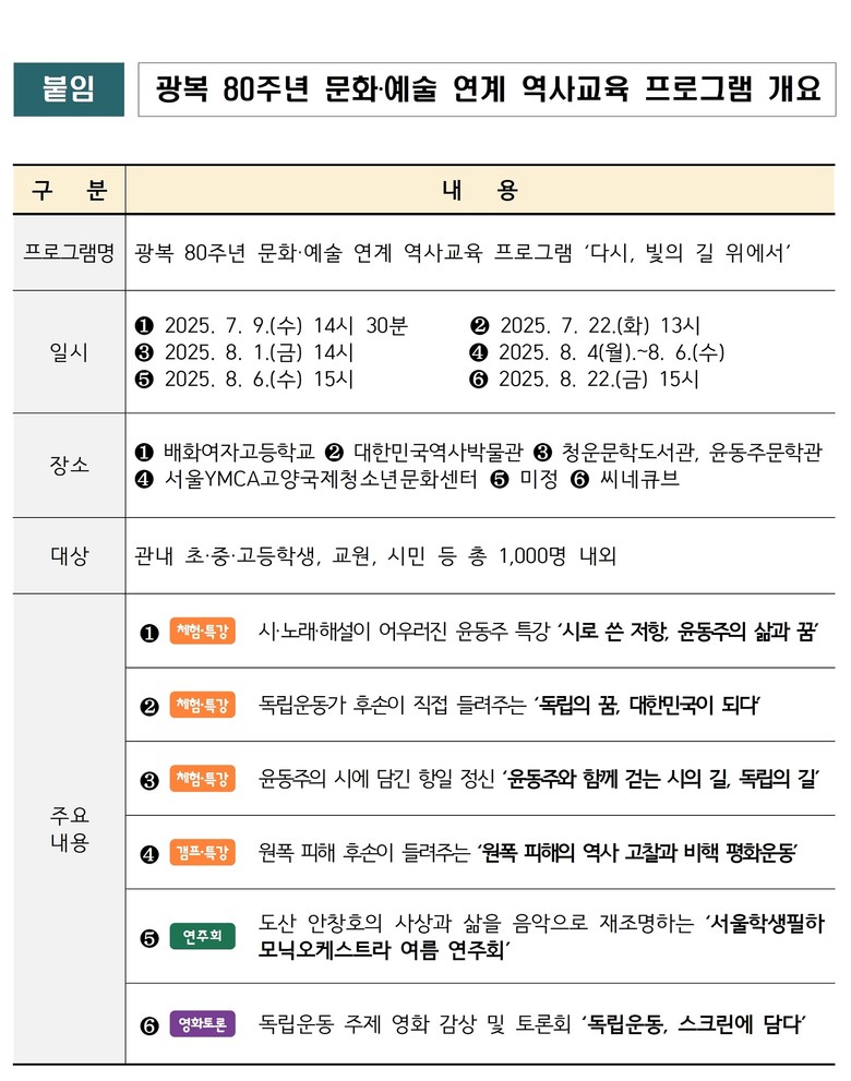 8월 22일(금)에는 광화문 씨네큐브에서 교원 200여 명이 참여하는 ‘독립운동, 스크린에 담다’ 프로그램이 진행된다. 교원들은 독립운동을 주제로 한 영화를 함께 관람한 뒤, 감독과 배우가 참여하는 토론회에 참석한다. 작품에 담긴 역사적 의미와 정신을 함께 공유하며 단순한 영화 감상을 넘어선 교육적 공감의 시간을 갖는다.