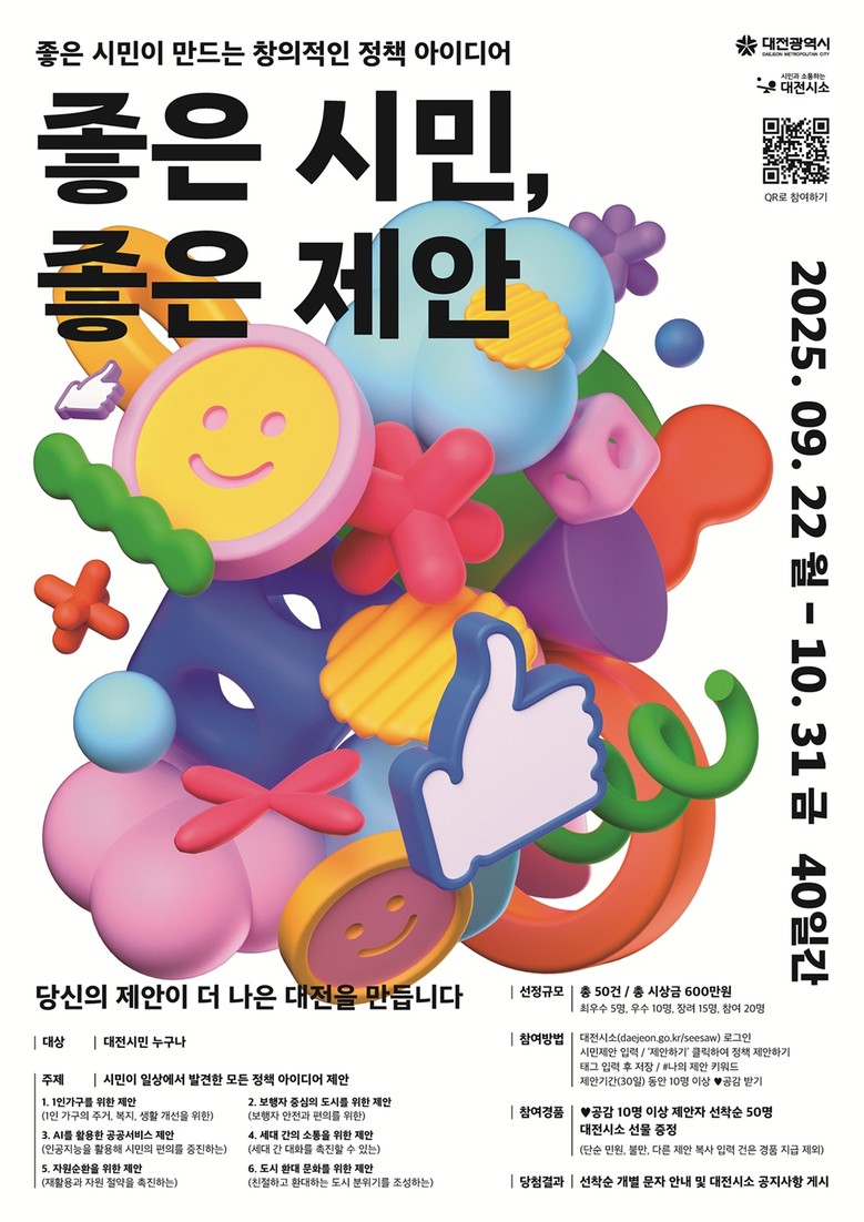 대전시는 올해 1월 1일부터 10월 31일까지 대전시소에 등록된 제안 중 부서 검토가 완료된 건을 대상으로, 실시 가능성·창의성·효율성·지속성 등 네 가지 기준에 따라 11월 중 전문가 심사를 거쳐 최종 선정할 예정이다. 또한 공감 10명 이상을 받은 제안자 중 50명에게는 추첨을 통해 소정의 상품을 제공해 시민참여를 더욱 활성화할 계획이다.