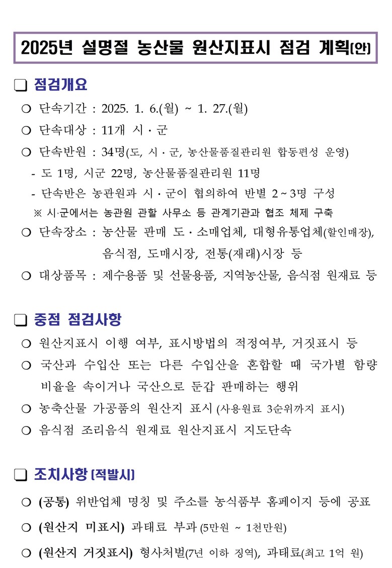 원산지 미표시, 거짓 표시, 부적절한 표시 방법에 대해 철저히 점검하여 소비자들이 믿고 구매할 수 있는 안전한 먹거리가 제공될 수 있도록 할 예정이다.