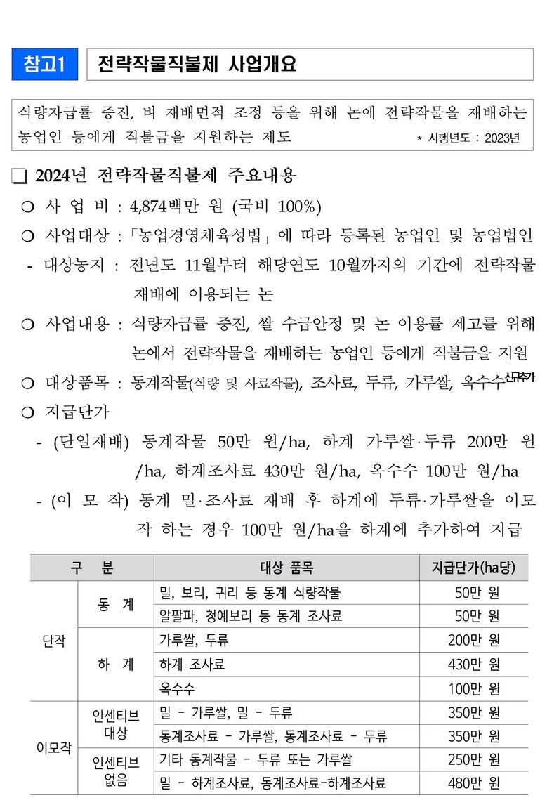또한, 2025년에는 신규 품목으로 깨가 추가되며, 동계작물 밀은 50만 원 인상된 100만 원, 하계조사료는 70만 원 인상된 500만 원으로 지급액이 인상될 예정이다.