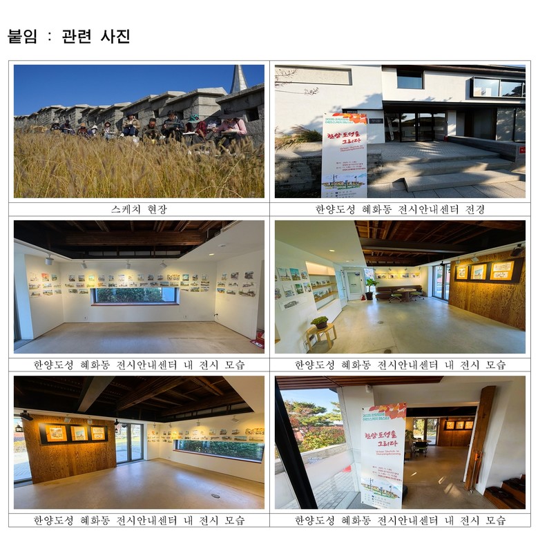 아름다운 한양도성을 보존하고 유네스코 세계문화유산의 등재를 염원하는 시민들의 마음을 담아, 11월 1일부터 11월 15일까지 한양도성 혜화동 전시안내센터에서 작품들을 전시하며 11월 15일 전시 마지막날에는 한양도성 혜화동 전시안내센터 일대에서 스케치 행사가 한번 더 진행될 예정이다.