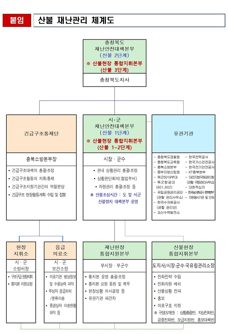 충북도는 도지사를 충청북도 재난안전대책본부 본부장에, 행정부지사를 차장으로, 재난안전실장을 총괄조정관, 산림환경국장을 통제관, 산림녹지과장을 담당관으로 각각 구성했다.