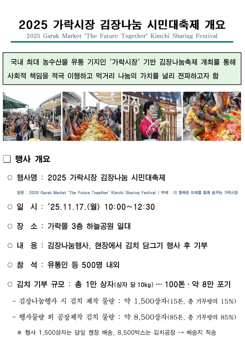 가락김장축제는 '08년 처음 태동하여 '25년까지 18년 간, 단 한해도 거르지 않고 진행되어온 가락시장 전통의 먹거리 나눔행사이다. 시장을 구성하는 유통인과 공사가 예산을 마련하고 시민.어린이.외국인 등 자원봉사자들과 함께 김장을 담궈 서울시 1만 가구에 김치를 전하는 본 행사는 어려운 이웃에 온정을 전하는 것에 그치지 않고 '나눔의 가치'를 각 기업과 단체에 선제적으로 전파하는 역할을 계속해왔다.
