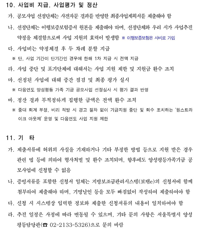 마채숙 서울시 여성가족실장은 “양성평등 문화 확산, 저출생 위기 등 우리 사회가 당면한 과제 해결을 위해서는 민간단체의 참신한 기획력과 전문성이 절실한 상황”이라며 “우리 사회를 긍정적인 방향으로 변화시키고자 하는 역량있는 단체들의 많은 참여를 바란다.”라고 말했다.