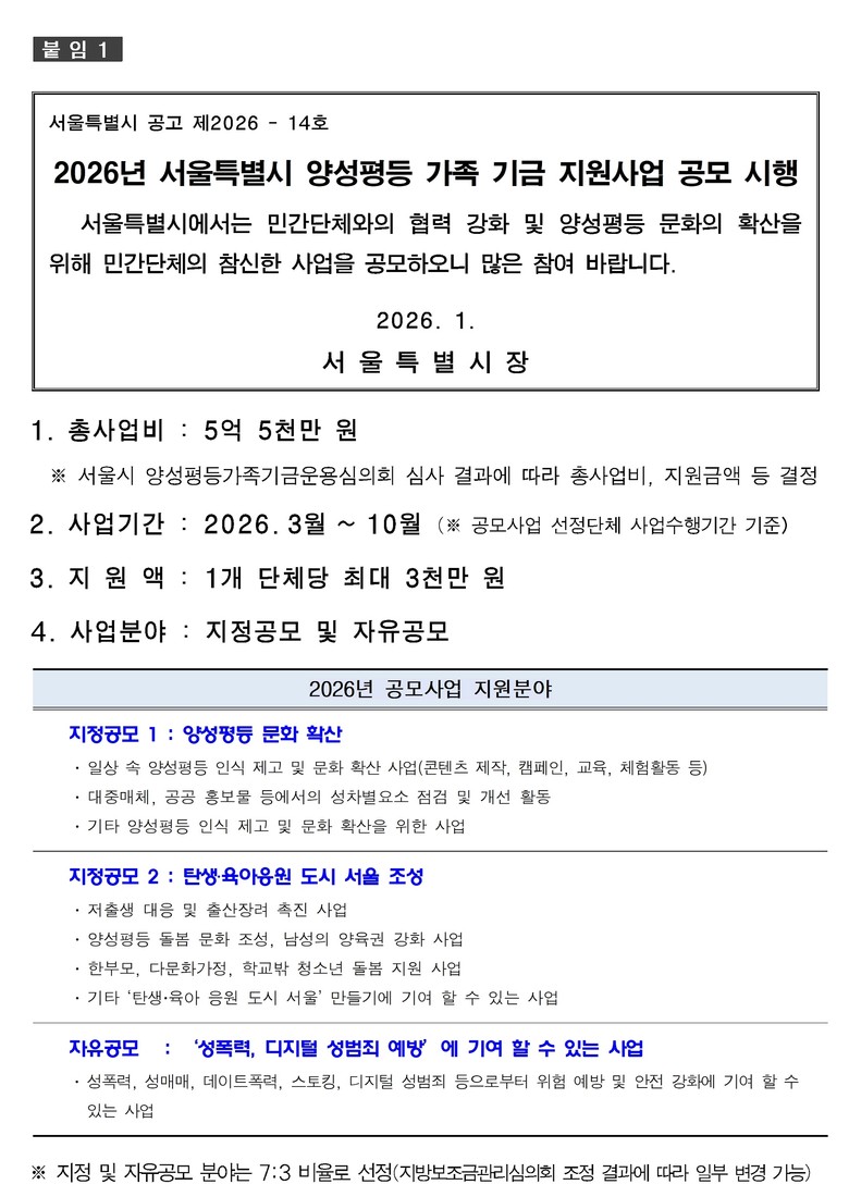 [서울 세계타임즈=이장성 기자] 서울시는 양성평등 문화 확산과 양성평등 정책의 효율적 추진, 사회적 이슈에 대한 시의성 있는 대응을 위해 「2026년 양성평등 가족 기금지원 사업」을 실시한다고 밝히고, 공모를 시작한다. 총 5억 5천만 원 규모로, 사업별로 최대 3천만 원을 지원한다.