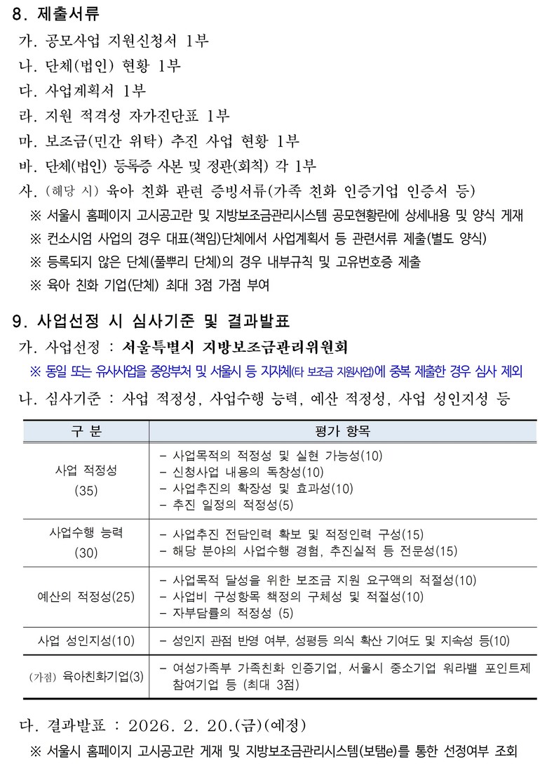 자세한 사항은 서울시 누리집 ‘고시공고란’ (https://seoul.go.kr/news/news_notice.do) 및 지방보조금 관리시스템 ‘공모사업 검색’란(https://www.losims.go.kr/sp/pbcnBizSrch)에서 확인 가능하다.