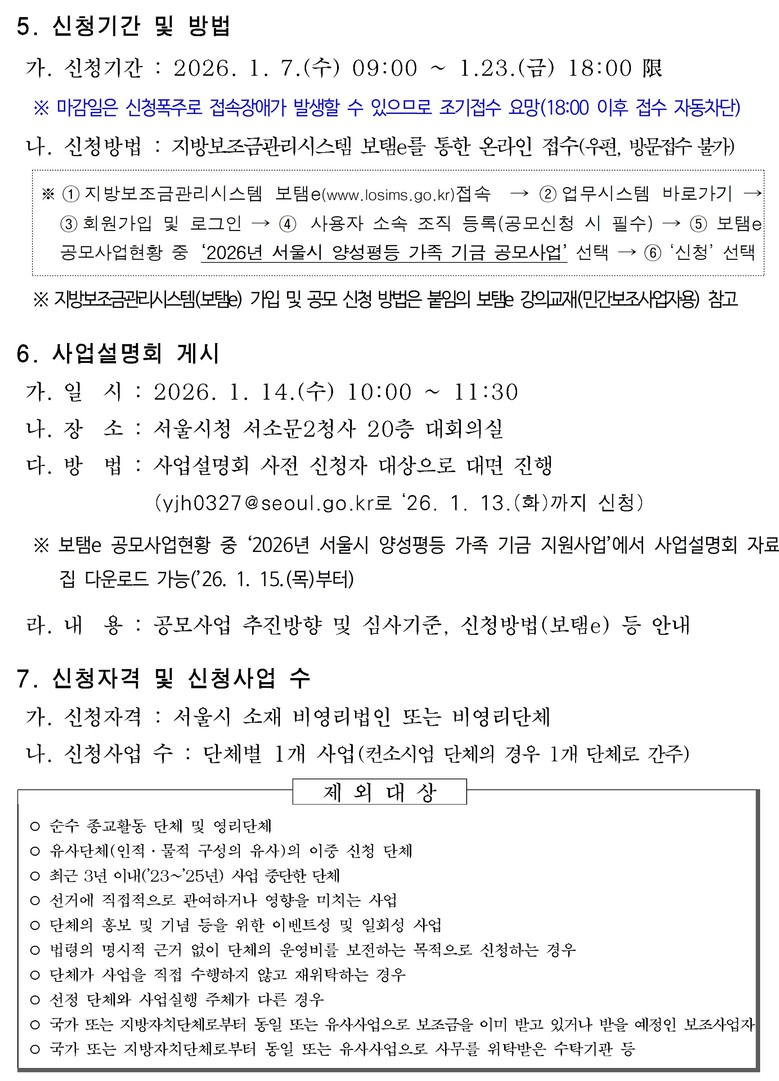 서울시는 사전 신청한 단체들을 대상으로 오는 14일(수) 사업설명회를 개최할 예정이다. 사업설명회에서는 사업내용, 신청방법(지방보조금관리시스템(보탬e)), 심사기준, 사업 능력이 없거나 부적정한 단체 참여 배제를 위한 현장점검 등을 상세히 설명할 예정이다.