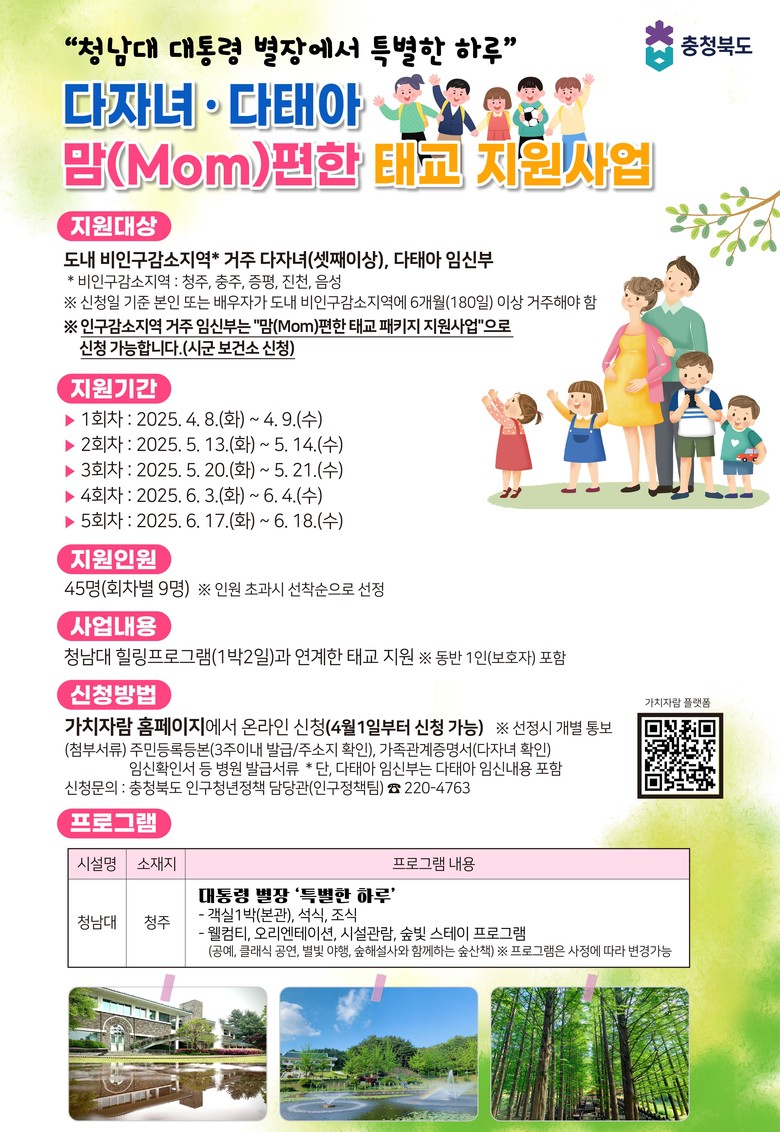 한편, 인구감소지역(제천, 보은, 옥천, 영동, 괴산, 단양) 맘(Mom) 편한 태교패키지 지원사업은 해당 시군 보건소에서 신청 가능하며, 다자녀 가족과 함께 참여 가능한 다자녀 가족캠프도 시군에서 접수 중이다.