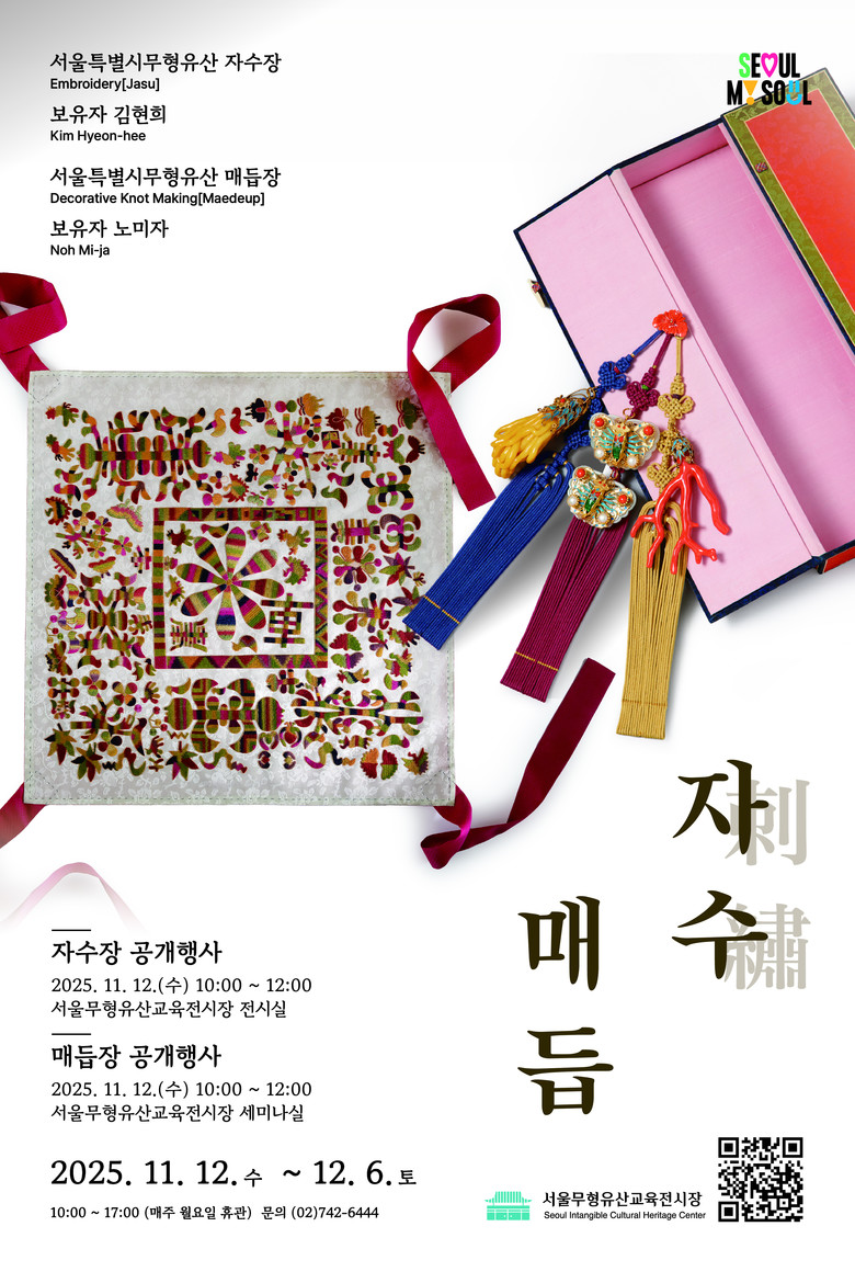 - 서울무형유산 교육전시장에서는 매듭·자수·옥장의 전시와 공개행사(12일, 14일)