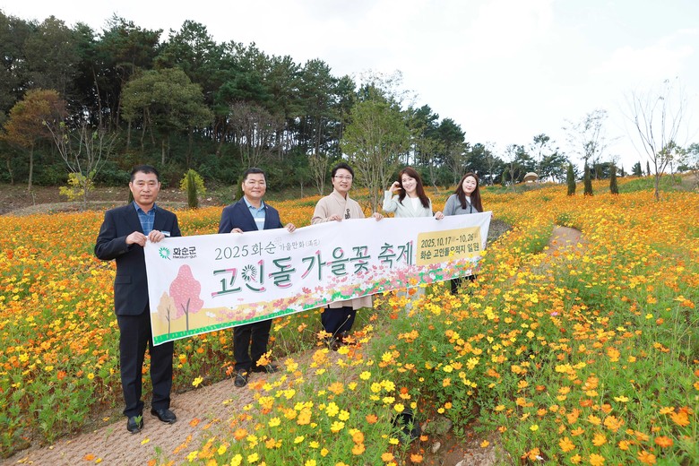 이후 축제장을 방문한 한 작가는 노란 코스모스가 만발한 꽃밭 속에서 관계자들과 함께 화순의 주요 관광지를 담은 홍보 배너를 들고 기념촬영을 진행했다. 그는 “이런 곳이 제 고향 화순에 있다는 사실이 믿기지 않는다”며 “고인돌유적지와 가을꽃축제가 세계적으로 알려지길 바란다”고 소감을 전했다.