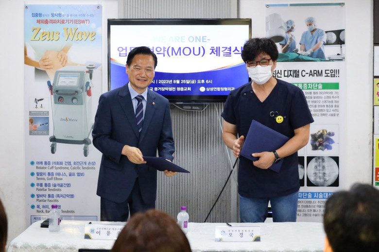 | ▲이용우 정읍교회 담임강사와 삼성연합정형외과병원 오경국 사무국장이 협약서에 서명을 하고 있다 |