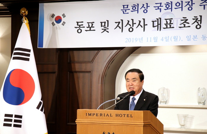 문 의장은 인사말을 통해 “지금의 어려운 난국을 하루 빨리 타개할 수 있도록 한국정부와 의회가 혼신의 힘을 다하겠다”면서 한일관계의 개선의지를 피력한 뒤, “재일 동포 여러분은 맨주먹으로 시작하여 눈물겨운 노력과 도전정신으로 오늘날 성공적인 동포사회를 이루어냈다.