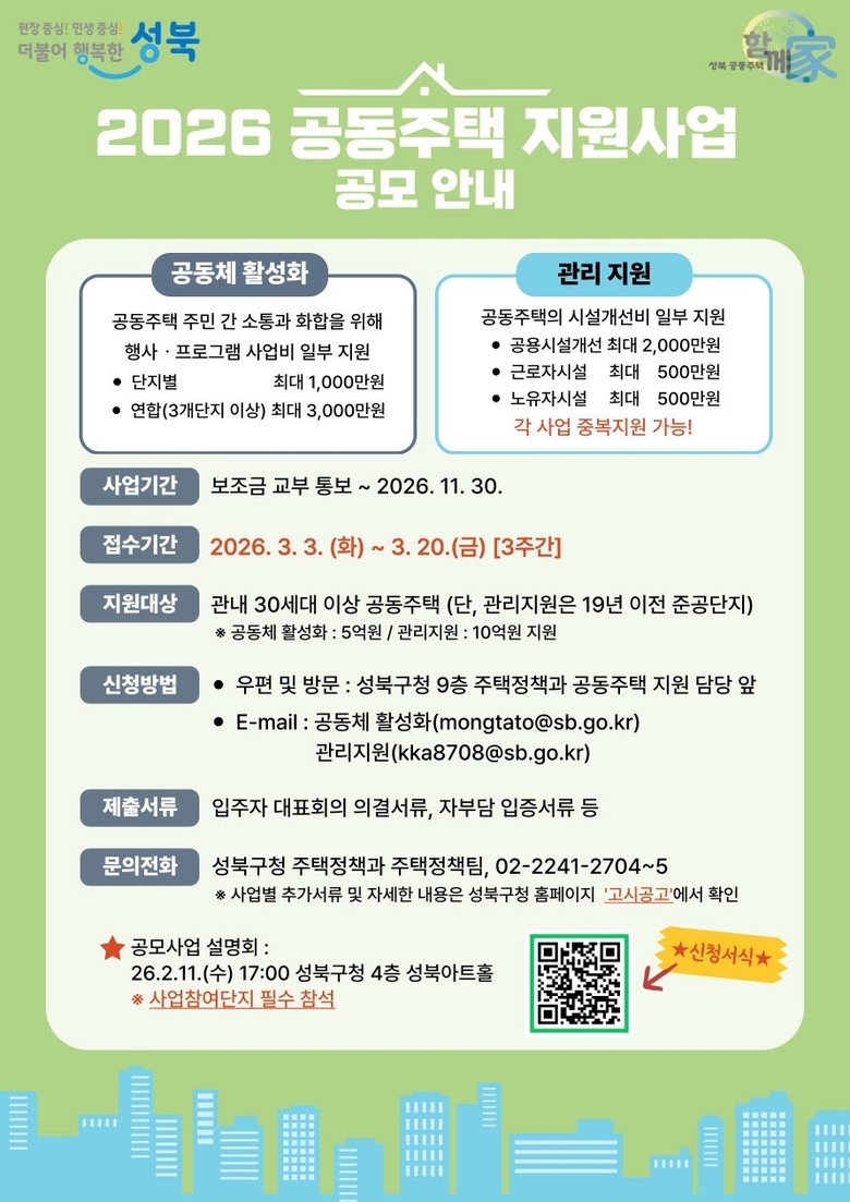 - 300세대 미만 소규모 단지 지원 확대 [성북구 세계타임즈=이장성 기자] 서울 성북구(구청장 이승로)가 이웃 간 소통과 화합을 증진하고 쾌적한 주거환경 조성을 지원하기 위한 ‘2026년 공동주택 지원사업’ 공모를 실시한다.