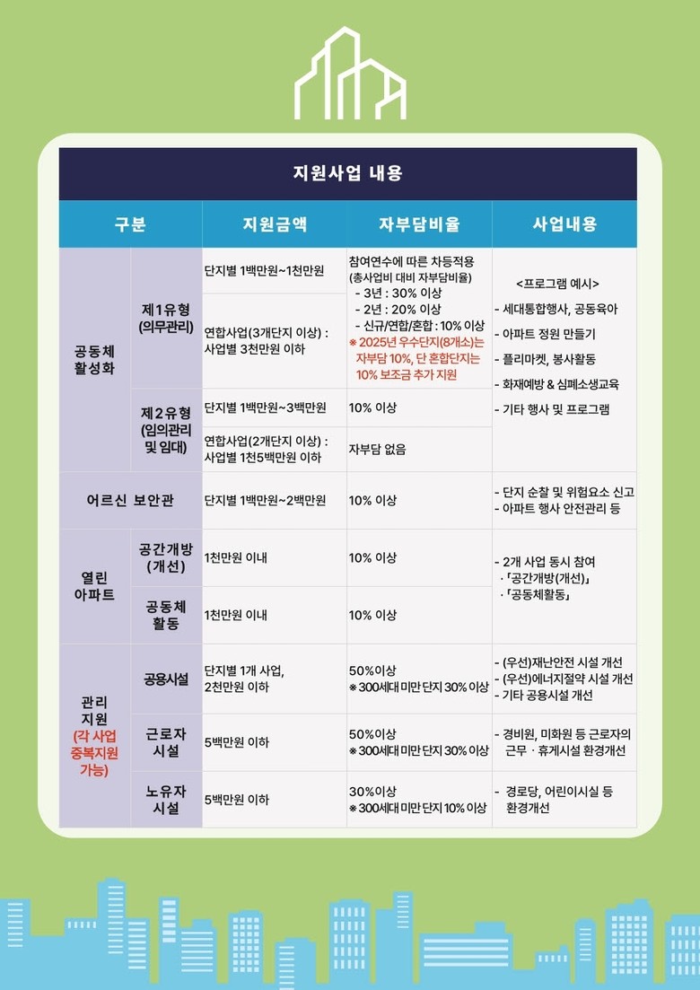 - 공동체 활성화, 어르신 보안관, 열린 아파트, 관리지원 사업 등 총 4개 분야 공모