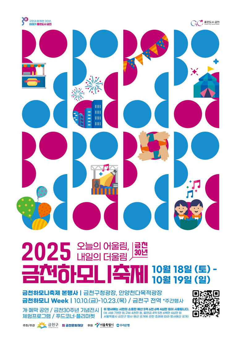 ‘금천 30년, 오늘의 어울림 내일의 더울림’을 주제로 진행되는 이번 행사는, 금천구민 모두가 함께하는 ‘어울림’과 축제의 감동이 지역을 넘어 퍼져나가는 ‘더울림’을 경험할 수 있는 화합과 소통의 장을 만날 수 있다.