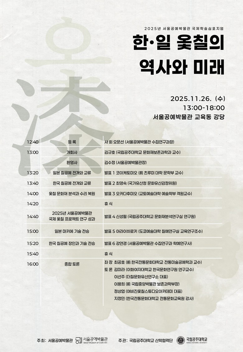 전(前) 일본 츠루미대학 코이케 토미오 교수의 ‘일본 칠공예 전개와 교류’를 시작으로, ▲국가유산청 최영숙 문화유산감정위원의 ‘한국 칠공예 전개와 교류’, ▲교토예술대학 오카다후미오 교수의 ‘옻칠 문화재 분석과 수리 복원’, ▲국립공주대 신성필 연구원의 <2025년 서울공예박물관 국제 옻칠 프로젝트> 연구 성과, ▲도쿄예술대학 아라이 히로키 연구원의 ‘일본 마키에 기술 전승’, ▲서울공예박물관 강연경 학예연구사의 ‘한국 칠공예 장인과 기술 전승’ 발표가 이어진다.