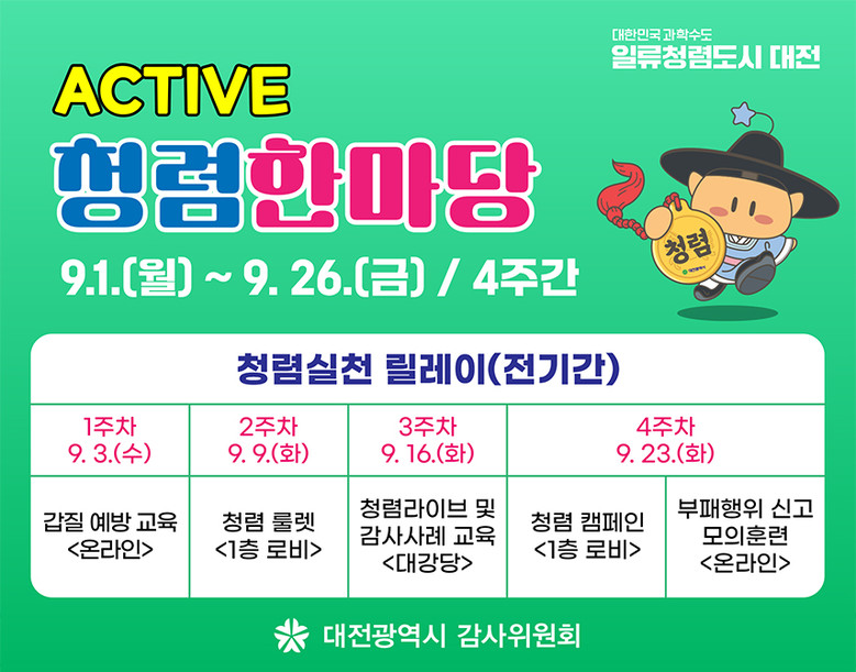 프로그램은 ▲간부공무원 청렴실천 릴레이 ▲청렴 라이브 공연 및 감사사례 교육 ▲청렴 룰렛 이벤트 ▲청렴 캠페인 등 직원들의 참여를 이끌어낼 수 있는 다양한 내용으로 구성됐다. 특히 지난 9월 8일에는 이장우 대전시장이 청렴실천 릴레이의 첫 주자로 참여해 강한 청렴 의지를 대내외에 표명했다.