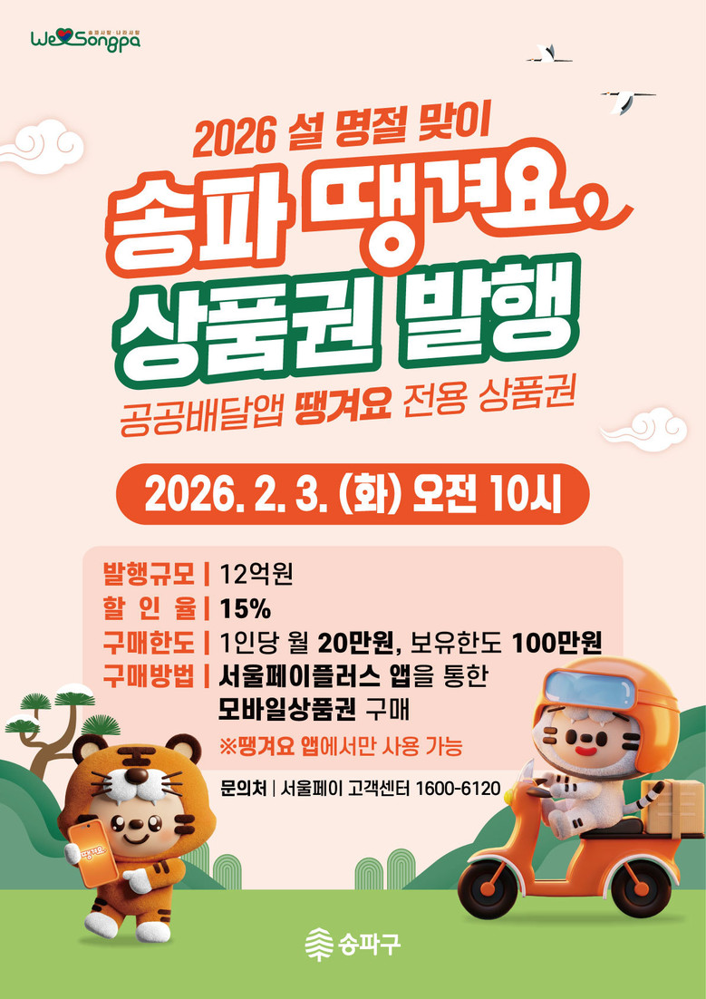 또한, 명절 연휴 기간 배달 음식 수요 증가에 대비해 공공배달앱 전용 상품권인 ‘송파떙겨요상품권’도 총 12억원 규모로 별도 발행한다. 오는 2월 3일 화요일 오전 10시부터 판매를 시작, 소비자는 15% 할인된 금액으로 1인당 월 20만 원까지 구매할 수 있다.