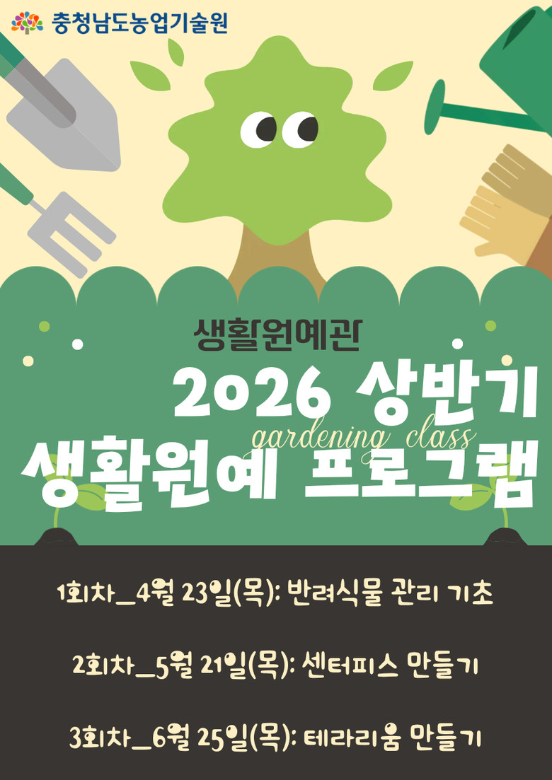 - 도 농기원, 4-6월 매월 첫 주 월요일마다 온라인 선착순 접수 - [충남 세계타임즈=이현진 기자] 충남도 농업기술원은 도민의 생활 속 식물문화 확산을 위해 ‘2026년 상반기 생활원예 프로그램’ 일반인 과정 참여자를 모집한다고 2일 밝혔다.