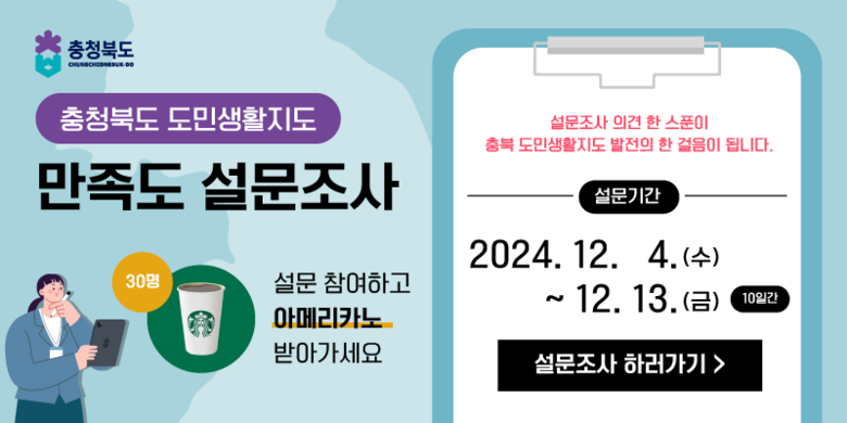 설문조사는 충청북도 누리집(www.chungbuk.go.kr) 배너 및 인터넷 웹페이지 검색 「충북 도민생활지도」를 통해 참여할 수 있다.