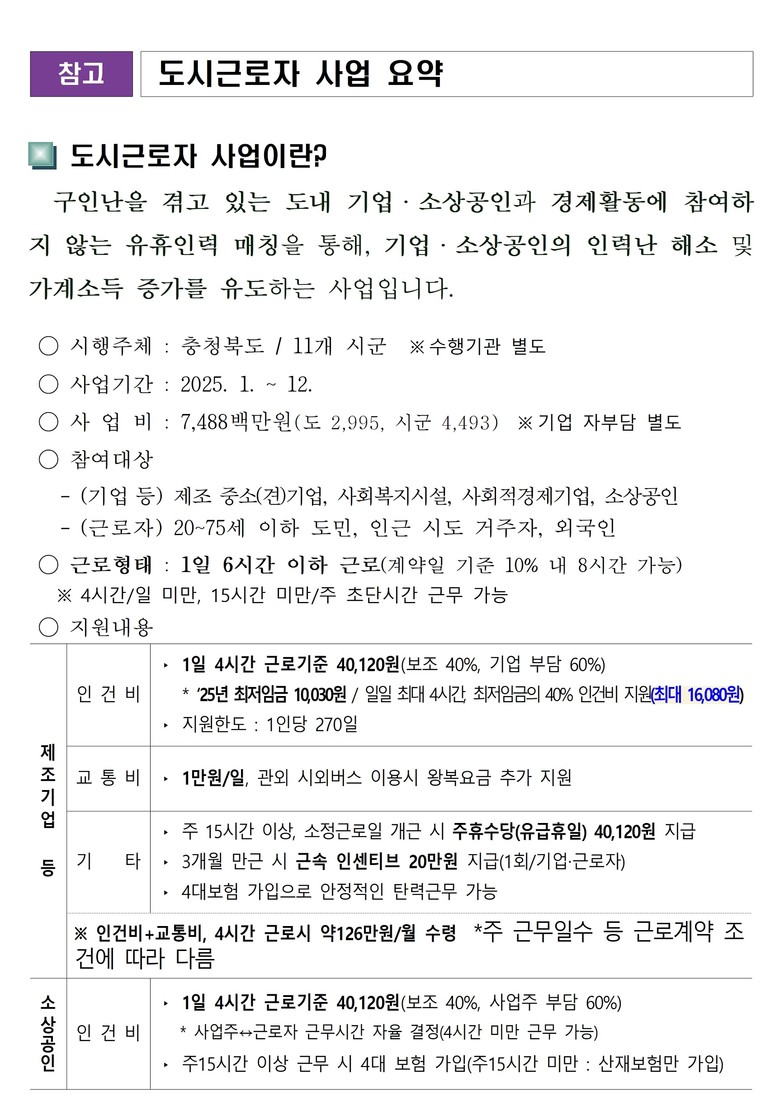 한편, 충북형 도시근로자 지원사업은 6시간 이내 단시간 근로를 희망하는 도민이면 누구나 참여가 가능하며, 기업과 소상공인은 참여자와 근로계약 체결 후 근로 임금을 지급하고, 지자체에서는 1일 최대 4시간까지 최저시급(10,030원)의 40%에 해당하는 인건비와 교통비, 근속 인센티브 등을 별도로 지원하고 있다.