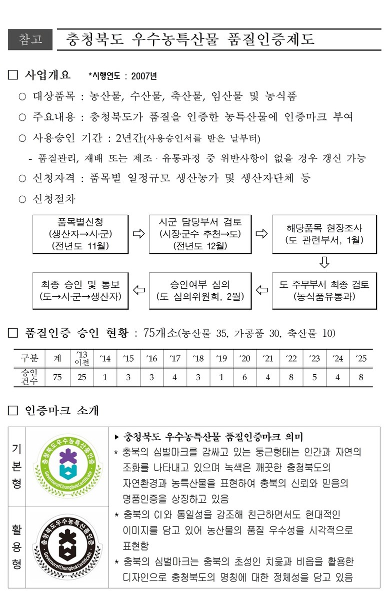 이필재 충북도 농식품유통과장은 “우수농특산물 품질인증은 소비자에게 안전한 먹거리를 보장하고, 지역 농산물의 경쟁력을 높이는 제도”라면서, “인증제도의 공신력을 강화할 수 있도록 적극행정을 추진하고, 도민이 안심하고 로컬푸드를 소비할 수 있는 환경을 만들어 나가겠다”고 말했다.