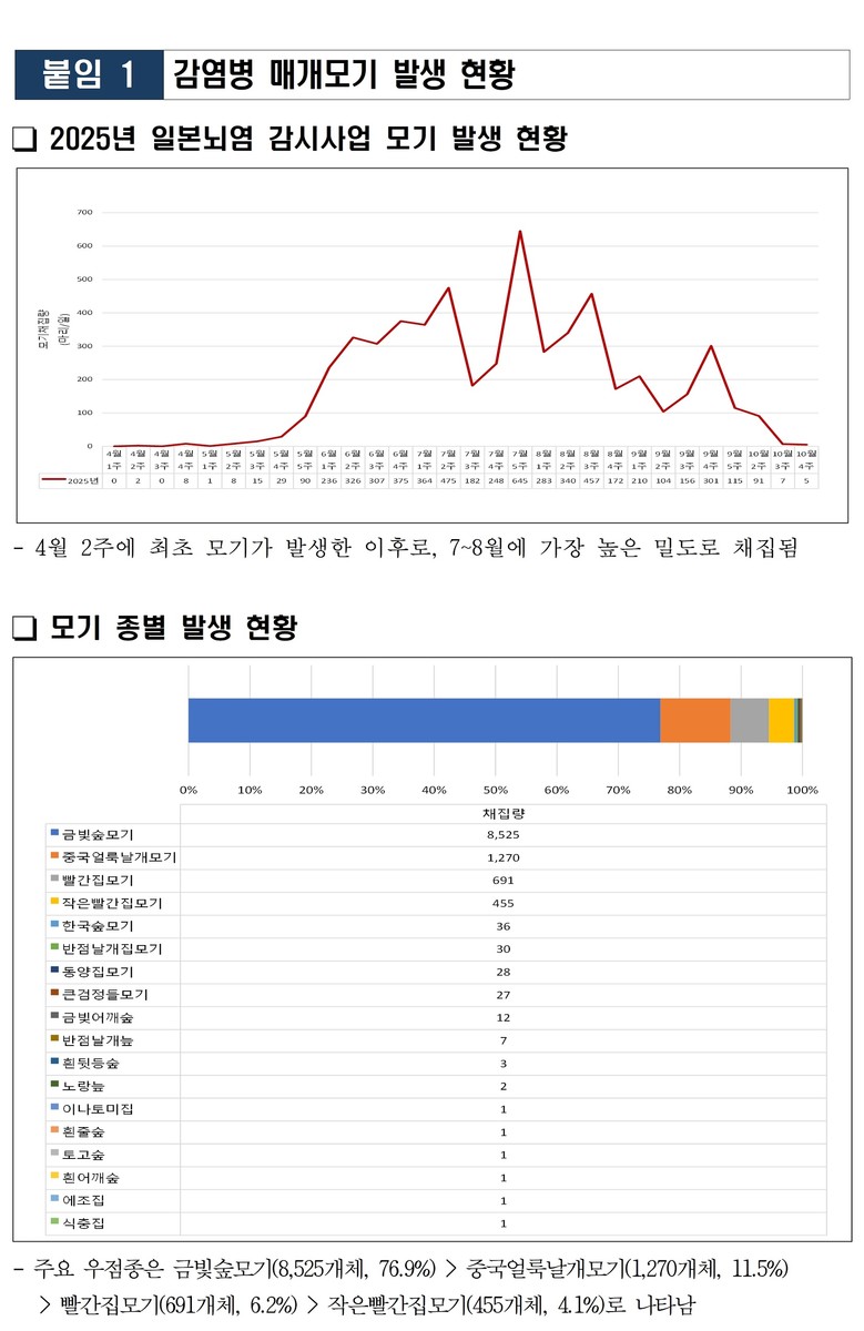 올해 채집된 모기 11,092개체의 주요 우점종은 금빛숲모기가 8,525개체(76.9%)로 가장 많았고, 중국얼룩날개모기(1,270개체, 11.5%) > 빨간집모기(691개체, 6.2%) > 작은빨간집모기(455개체, 4.1%) 순으로 나타났다. 병원체 5종은 모두 불검출되었다.