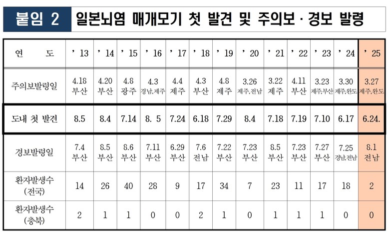 올해 전국 일본뇌염 환자는 2명이 확인되었으며 충북에서는 아직 환자가 보고되지 않았다. 지난해에는 전국적으로 21명의 일본뇌염 환자가 발생한 바 있어, 지속적인 주의가 요구된다.