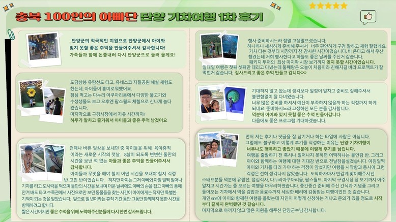 이번 여행에서 참가 가족들은 도담삼봉 유람선 탑승, 다누리아쿠아리움 관람, 팝스월드 체험, 구경시장 자유투어 등 다양한 프로그램을 즐기며 도내 관광지를 새롭게 경험할 예정이다. 특히, 아빠와 아이가 함께 미션을 수행하고 서로를 챙기며 여행을 이어가는 과정은 가족 간 유대감을 더욱 돈독히 하고, 오래 기억에 남을 특별한 하루를 선사할 것으로 기대된다.