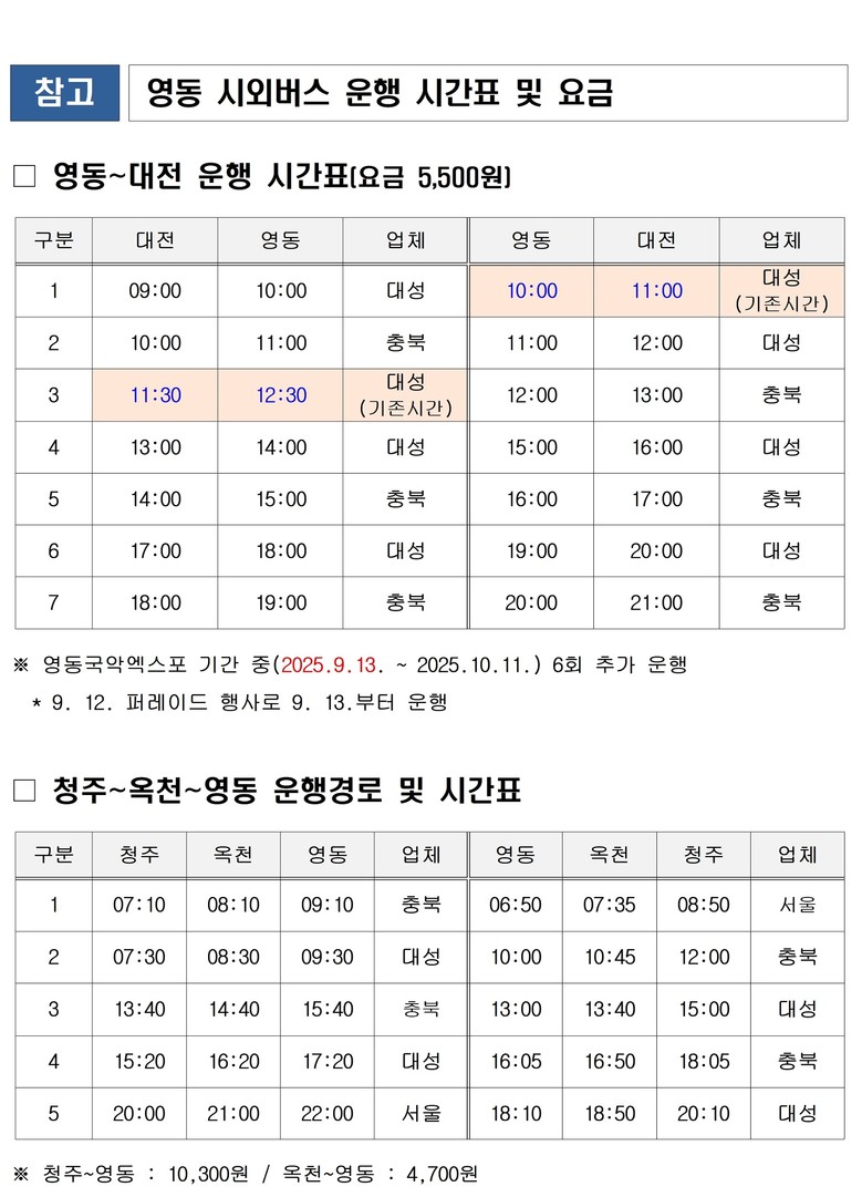 국악엑스포 기간 중 대전에서 영동을 운행하는 시외버스는 평상시 하루 1회 운행하였으나 인근 광역시인 대전시에서 엑스포를 관람하고자 하는 이용객이 많을 것으로 예상하고, 이번에 6회를 증회하여 관람객이 언제든지 대중교통을 이용하여 국악엑스포를 즐길 수 있도록 하였다.
