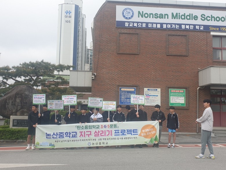 이우열 교장은 “최근 심각해지는 지구온난화와 기후변화에 대응하기 위해 무엇보다 학교에서 적극적인 자세로 환경교육에 임할 필요가 있다. 저탄소생활을 실천하기 위하여 전등끄기, 물아껴쓰기 등 작은 것부터 행동으로 옮길 수 있는 논산중학교 학생들로 키워가겠다”라고 말했다.