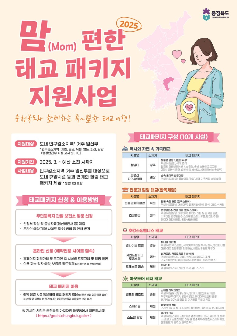 올해 태교패키지 지원사업에 참여하는 시설은 ▲청남대(청주), ▲초정행궁(청주), ▲포레스트 리솜(제천), ▲스테리움(제천), ▲전통문화체험관(옥천), ▲일라이트 호텔(영동), ▲벨포레 리조트(증평), ▲조령산자연휴양림(괴산), ▲자연드림파크 로움호텔(괴산), ▲소노벨 단양(단양) 10곳이다.