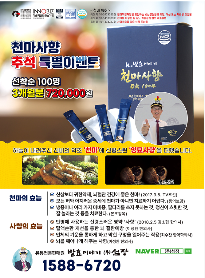 특히, 천마사향 32포가 들어 있는 1박스에는 3200mg의 영묘사향과 순도 90%의 무주산 천마 80%가 포함되어 있으며, 12가지 약재를 더해 발효한 가공식품으로 어지럼증, 중풍, 치매 등 뇌 질환 고통받는 분들에게 인기가 높다.