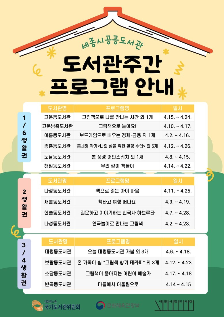 권역별로는 1·6생활권 도서관에서 ▲홍세영 작가와의 만남(종촌) ▲보드게임으로 배우는 경제·금융(아름) ▲봄 풍경 어반스케치(도담) 등의 프로그램을 만나볼 수 있다.